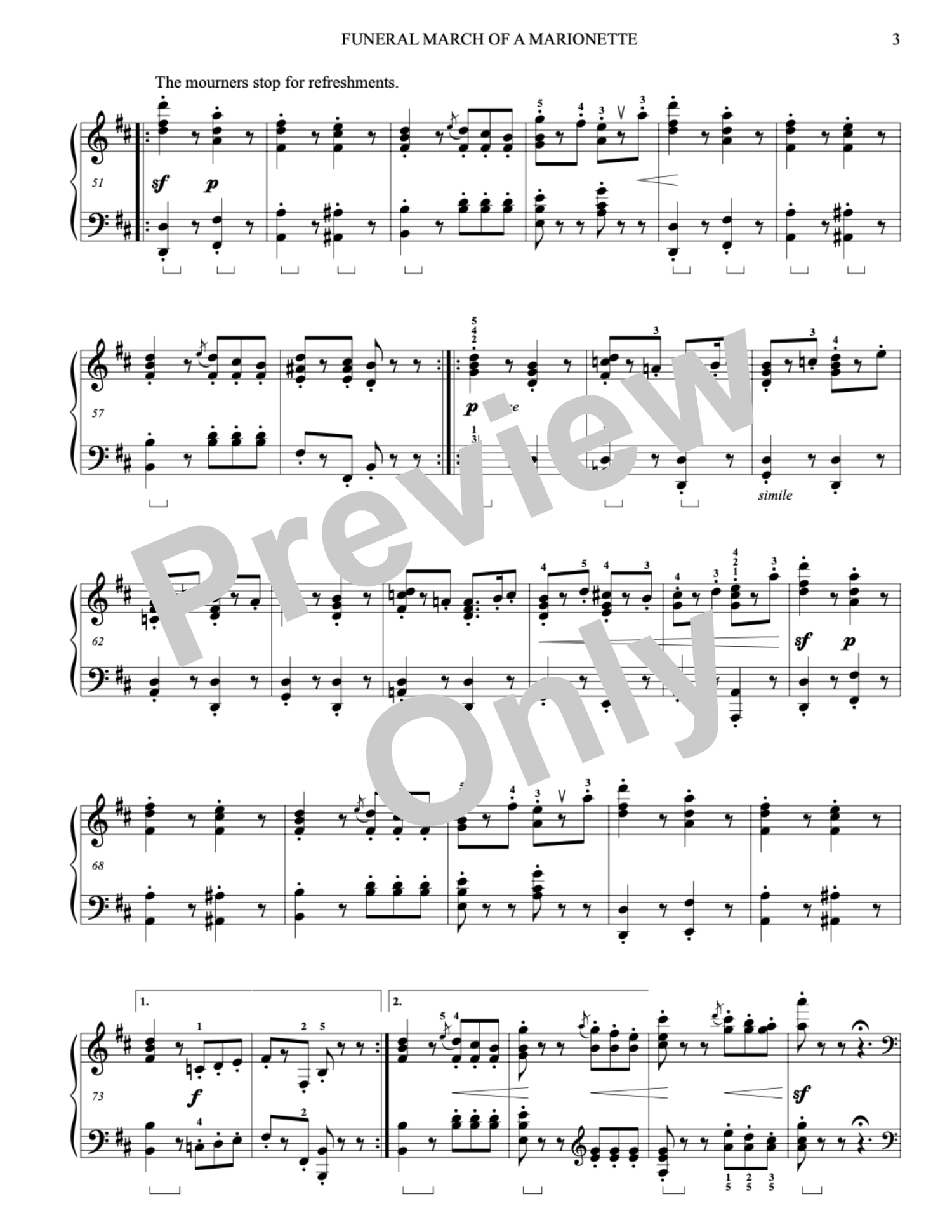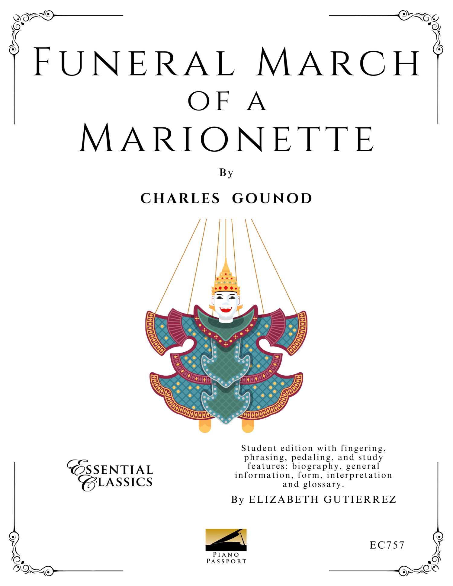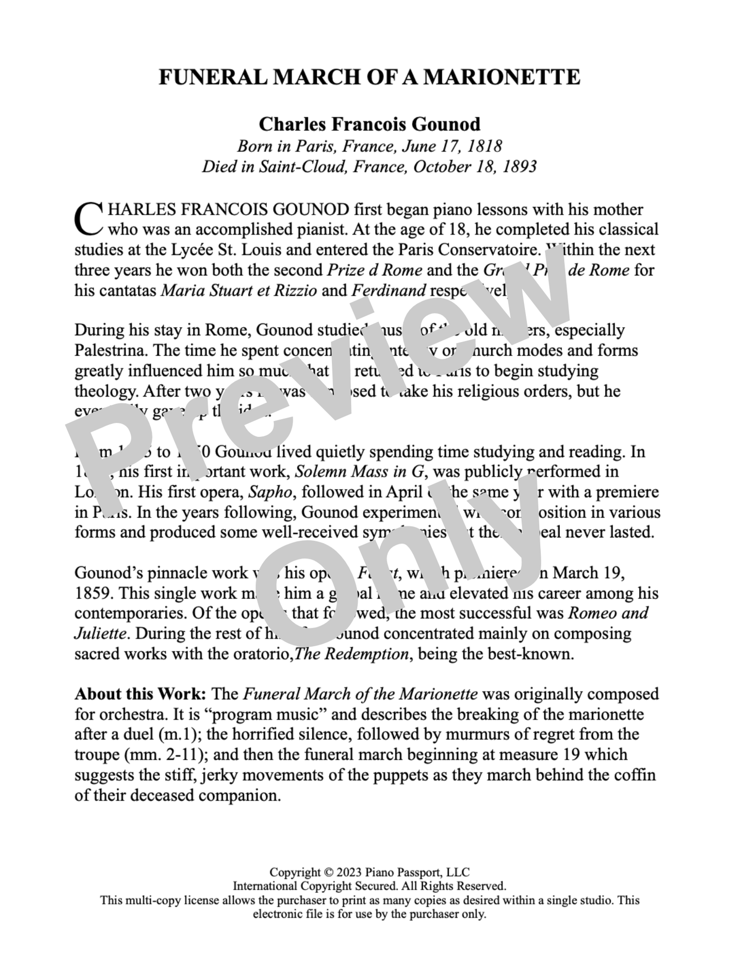 Gounod's famous "Marche funèbre d'une marionnette" was originally composed for piano solo in 1872 and later orchestrated. It's best known as the theme for "Alfred Hitchcock Presents." It follows the story line of the death of a marionette by duel and the ensuing funeral procession in the key of D minor. Inscriptions are included throughout the score to highlight. Edited by Elizabeth Gutierrez. An 8pp. digital PDF file with multi-copy license allowing the purchaser to print as many copies as desired ONLY within a single studio or household. This electronic file is for use by the purchaser only and may not be electronically transmitted nor posted on the internet.