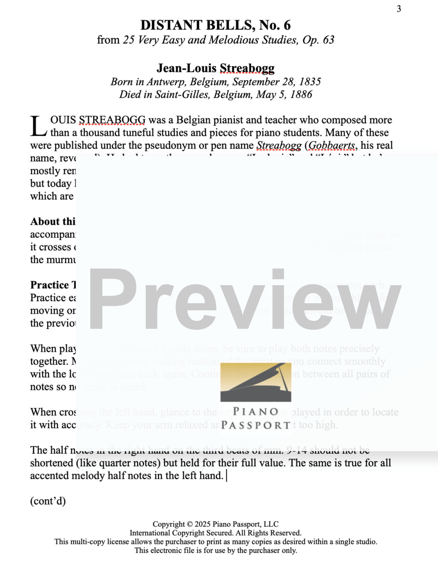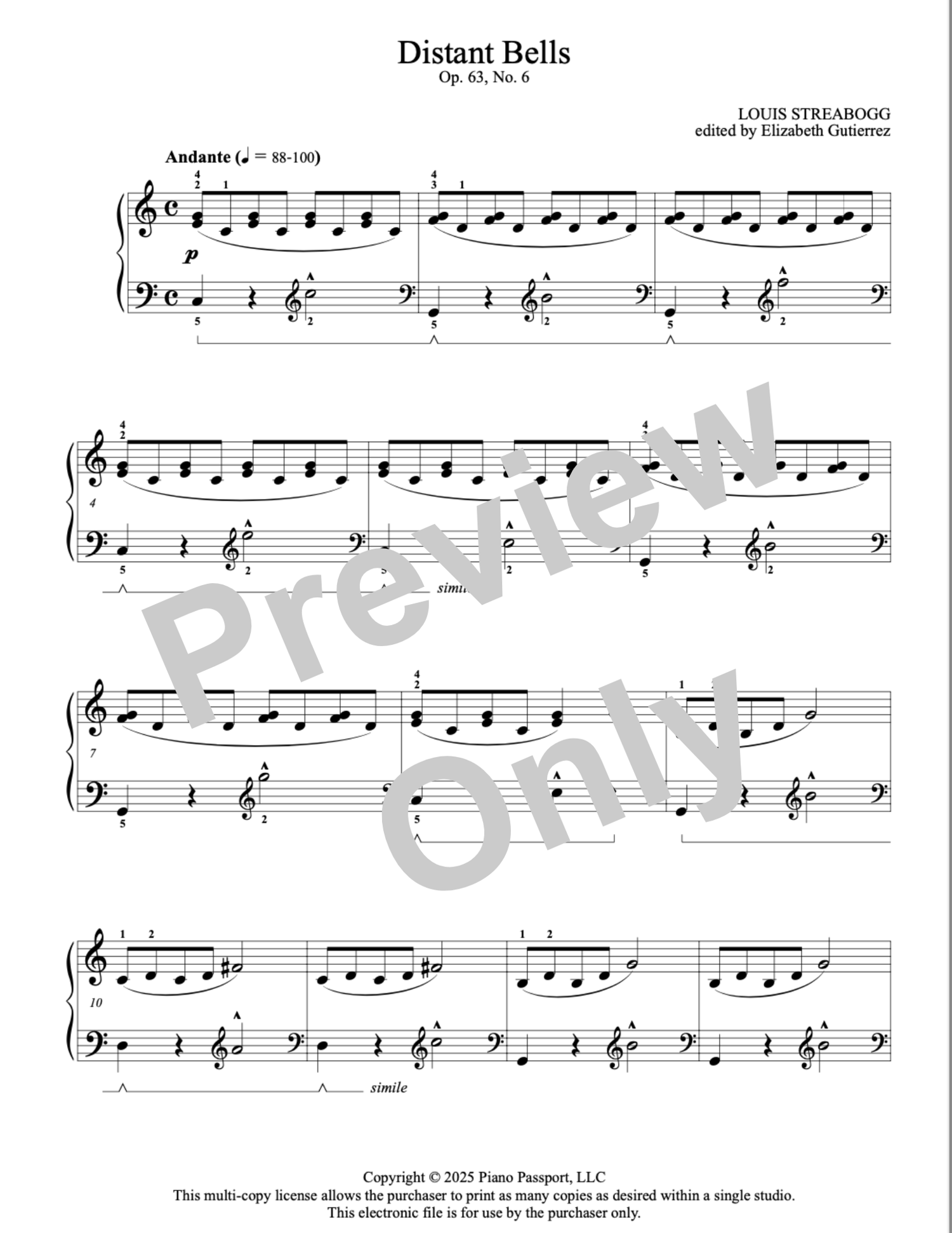 Louis Streabbog’s Distant Bells, Op. 63, No. 6, is a charming and evocative piece, ideal for developing expressive playing, a delicate touch, and pedal technique. This student edition features a clear, meticulously prepared score based on an early publication. Edited by Elizabeth Gutierrez, it includes practical fingerings, interpretive tips, and suggestions for mastering the piece’s bell-like effects. With its lyrical melody and shimmering broken chord patterns, Distant Bells is a beautiful choice for early intermediate pianists exploring tone, phrasing, and musical imagery.