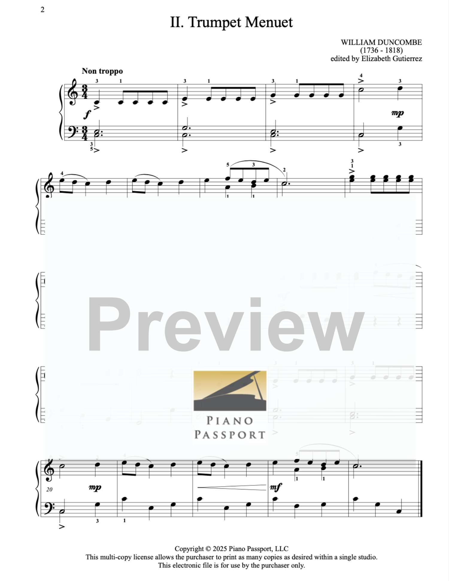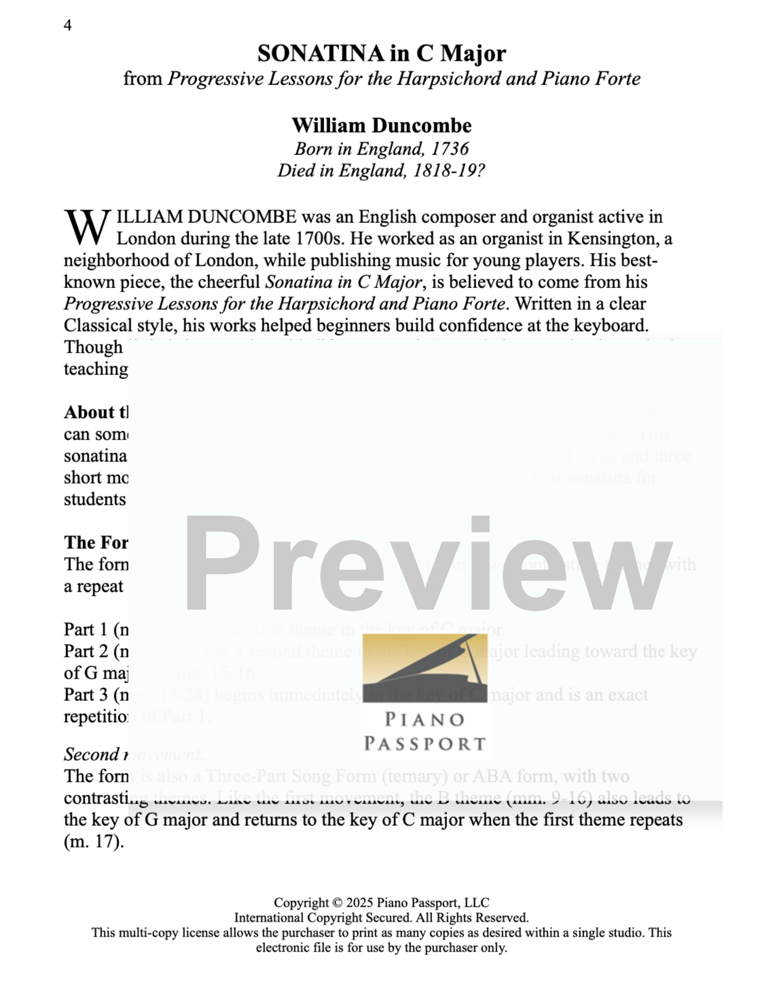 William Duncombe’s cheerful Sonatina in C Major is a timeless favorite for late-elementary pianists. Written in a clear Classical style, its three short movements—all in C major—feature balanced phrases, light textures, and tuneful melodies. The second movement offers a graceful Minuet, while the third sparkles with a lively Gigue. Long valued in teaching anthologies, this sonatina builds phrasing, dynamics, hand coordination, and stylistic awareness, making it an ideal first introduction to multi-movement form and Classical style. Researched and edited by Elizabeth Gutierrez.