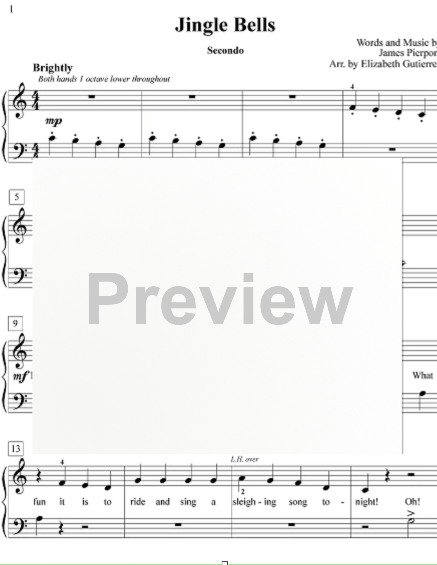 A true equal-part (equal in difficulty) primer-level piano duet of a beloved Christmas classic where both players have the opportunity of playing the melody at different times. Primo and Secondo parts are both written in Middle C position for easier reading. Keyboard position for both players is indicated in the score. Arrangement by Elizabeth Gutierrez. An 4pp. digital PDF file with multi-copy license allowing the purchaser to print as many copies as desired ONLY within a single studio or household. This electronic file is for use by the purchaser only and may not be electronically transmitted nor posted on the internet.