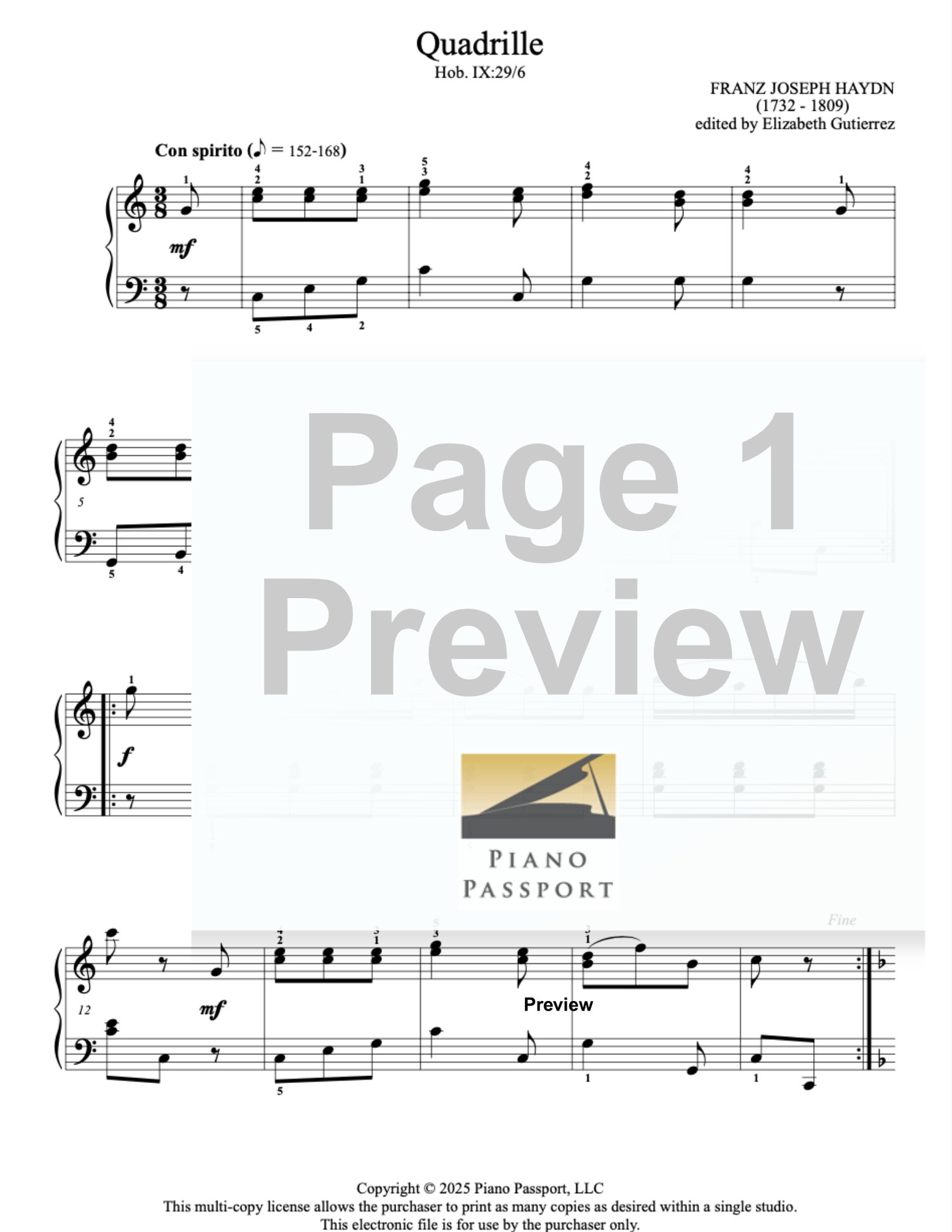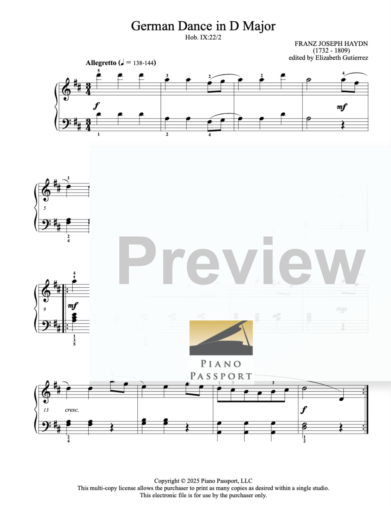 Introduce your late elementary and early intermediate students to the elegance and energy of Haydn’s Classical keyboard style with this charming set of three short works: the German Dance in D Major, Hob. IX:22/2, the Minuet in G Major, Hob. IX:8/8, and the Quadrille in C Major, Hob. IX:29/6. These pieces offer a delightful tour of 18th-century social dance music—graceful, witty, and full of Classical character—while developing essential skills in phrasing, balance, articulation, and stylistic clarity. This carefully researched student edition, edited by Elizabeth Gutierrez, provides practical fingerings, performance suggestions, and brief historical notes that help developing pianists understand each dance’s distinctive style. With accessible technical demands and engaging musical personalities, these selections make an inviting introduction to Haydn’s lighthearted, dance-inspired keyboard writing.