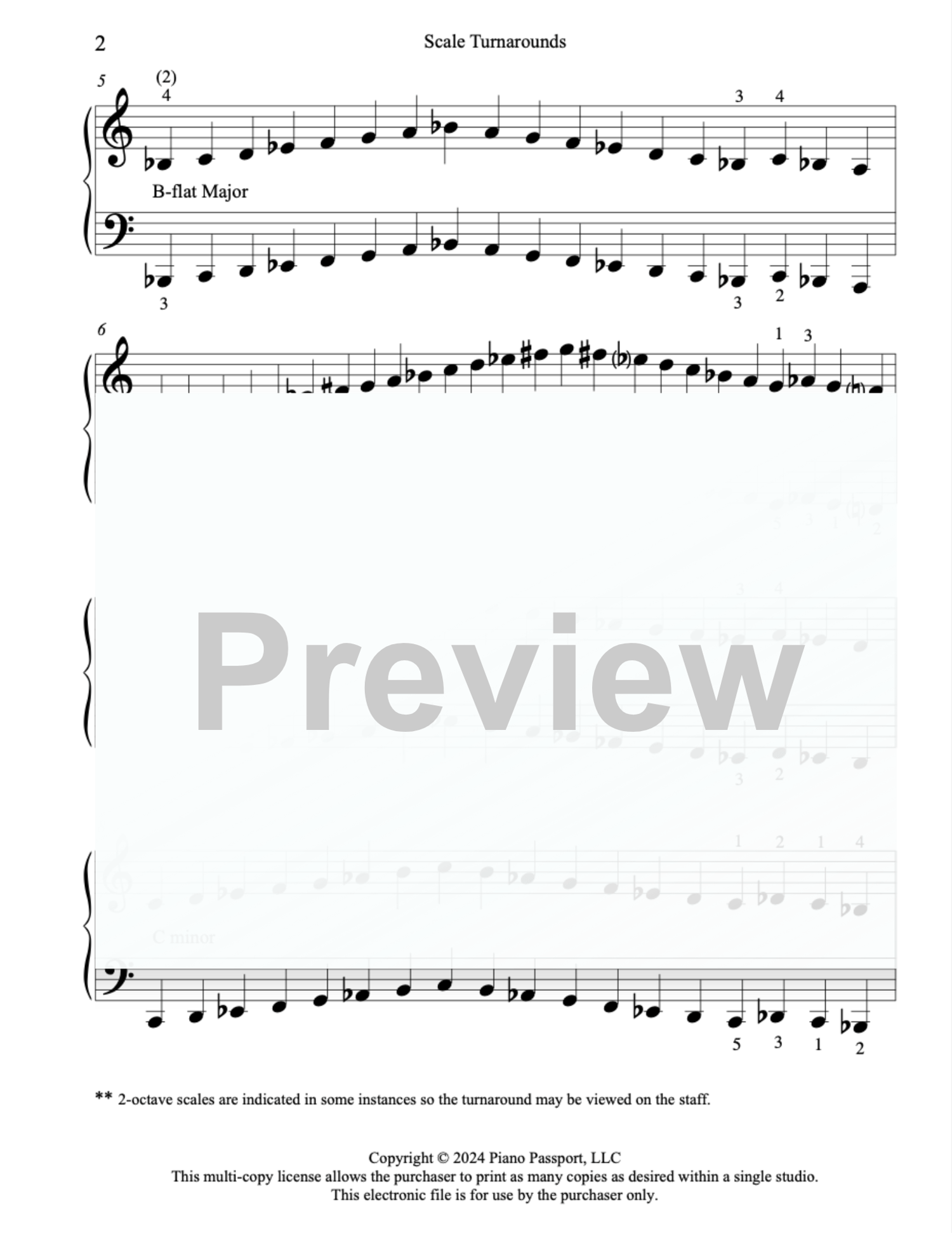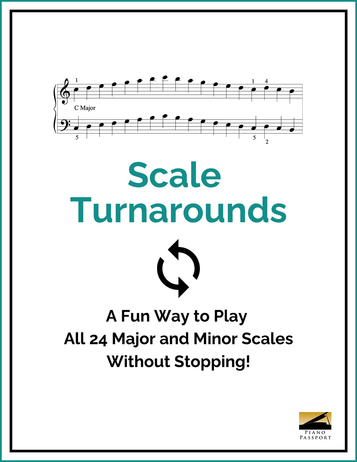 Finally! A unique way to play all 24 major and minor scales without stopping in between! Begin with the Key of C Major Scale and at the end, play a “turnaround” that leads you to its relative minor, the A minor scale. The A minor scale then leads to a turnaround to F major, then F major to D minor, and so forth all around the key circle until you reach the Key of C again. This PDF notates ALL the “turnarounds” for each scale so you know exactly what to do. Once you get the hang of it, it’s easy to memorize the turnaround pattern so can begin from anywhere in the cycle.