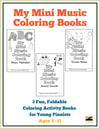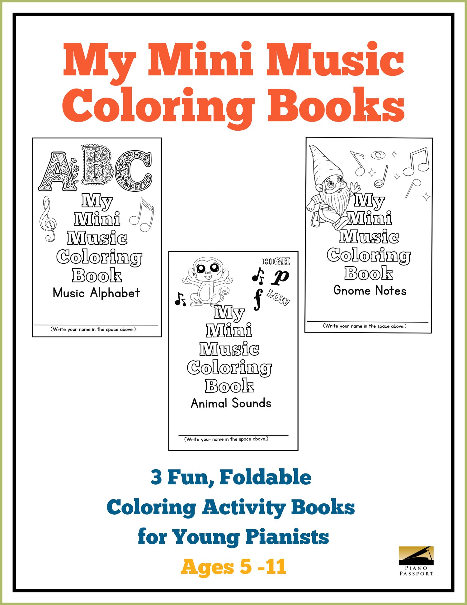 This set of three mini, foldable coloring books introduces young piano students (ages 5–11) to key musical concepts in a fun, hands-on way. Sized perfectly for little hands, they offer an engaging and educational activity at home, in the studio, or on the go. Use them as weekly practice trackers, recital or festival favors, studio gifts, classroom rewards, or a quiet activity while waiting for a lesson. Each book features simple, friendly illustrations that are quick to color and ideal for short attention spans, with a different musical focus in each title: