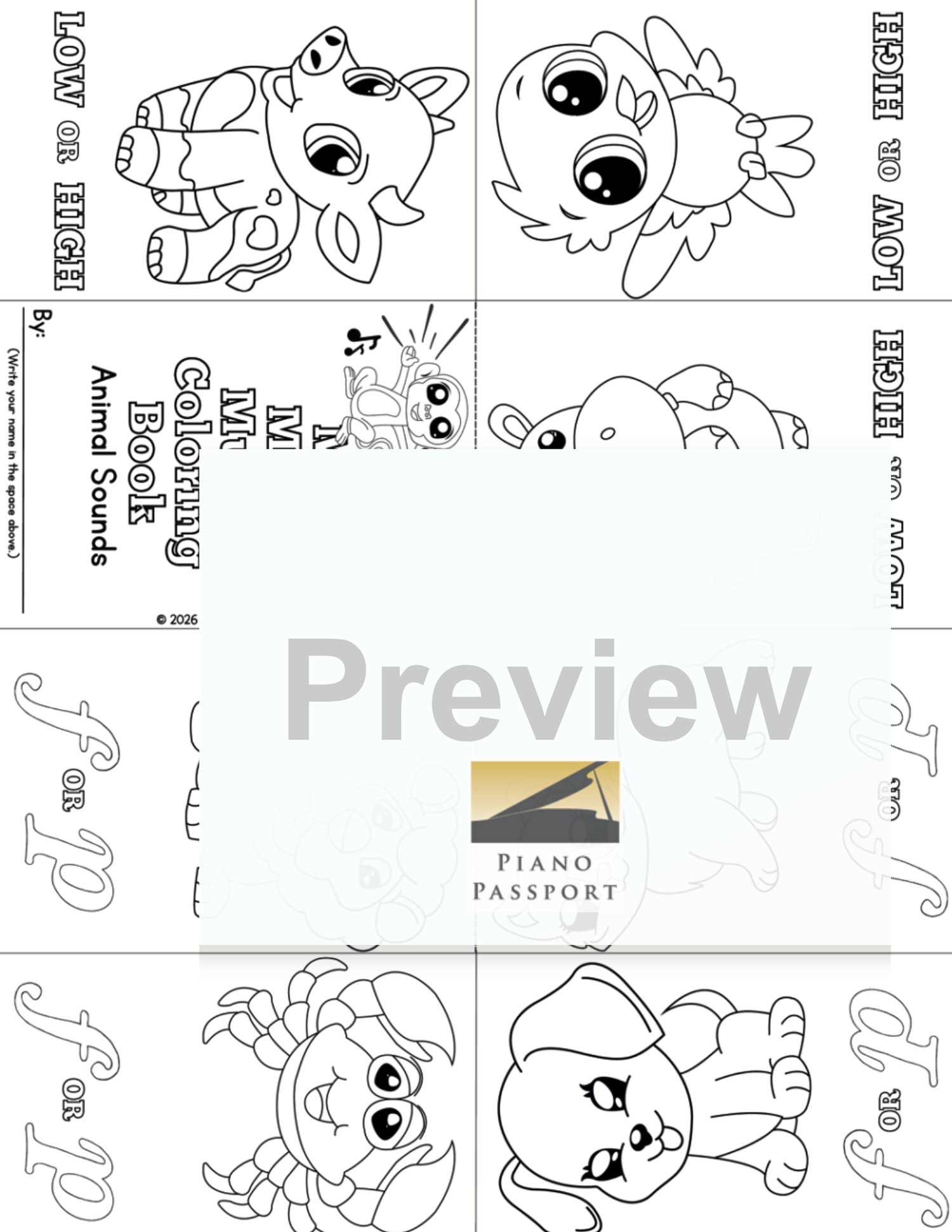 • Animal Sounds – explores high vs. low and piano vs. forte through cute animal illustrations