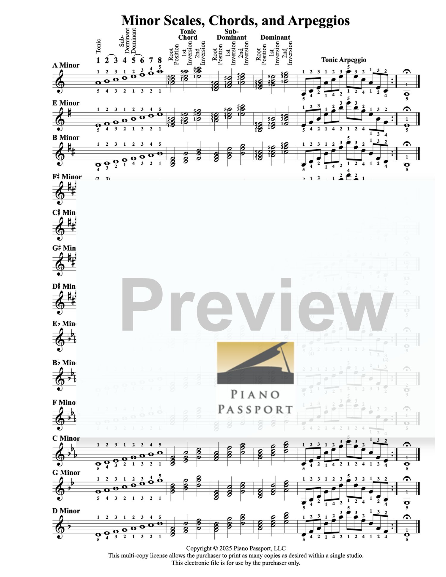 A companion to the chart in major keys! This one-page fingering chart provides a clear, concise guide to fingerings for all 12 minor scales, the primary i iv V chords with inversions, and two-octave tonic arpeggios. No need to flip through a scale book when everything is all on one page! Designed for pianists of all levels, this chart offers a quick reference presenting the information in a simple, easy-to-read format, including helpful practice suggestions to support technical development and streamline practice routines. An efficient and invaluable reference tool for building a solid foundation in scales, chords, and arpeggios. A two-page digital PDF file with multi-copy license allowing the purchaser to print as many copies as desired ONLY within a single studio or household. This electronic file is for use by the purchaser only and may not be electronically transmitted nor posted on the internet.