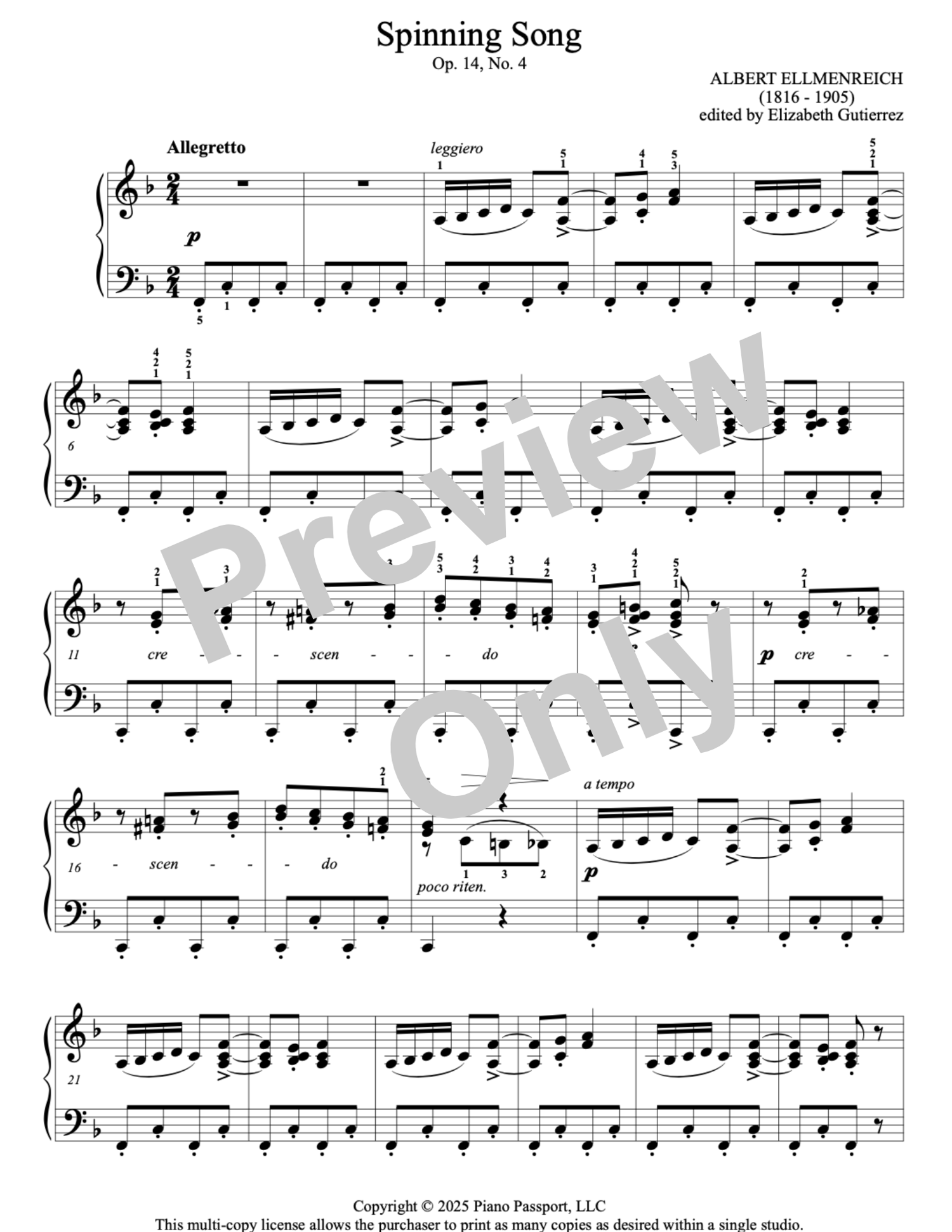 Albert Ellmenreich’s Spinning Song (Spinnlied), from his Musikalische Genrebilder, Op. 14, is a lively and engaging piece that captures the whirring motion of a spinning wheel through its energetic rhythm and playful melody. It’s a beloved favorite among students and teachers for its blend of technical challenges and musical charm. With its clear rhythmic drive and lighthearted character, Spinning Song is ideal for developing precision, articulation, and dynamic control.