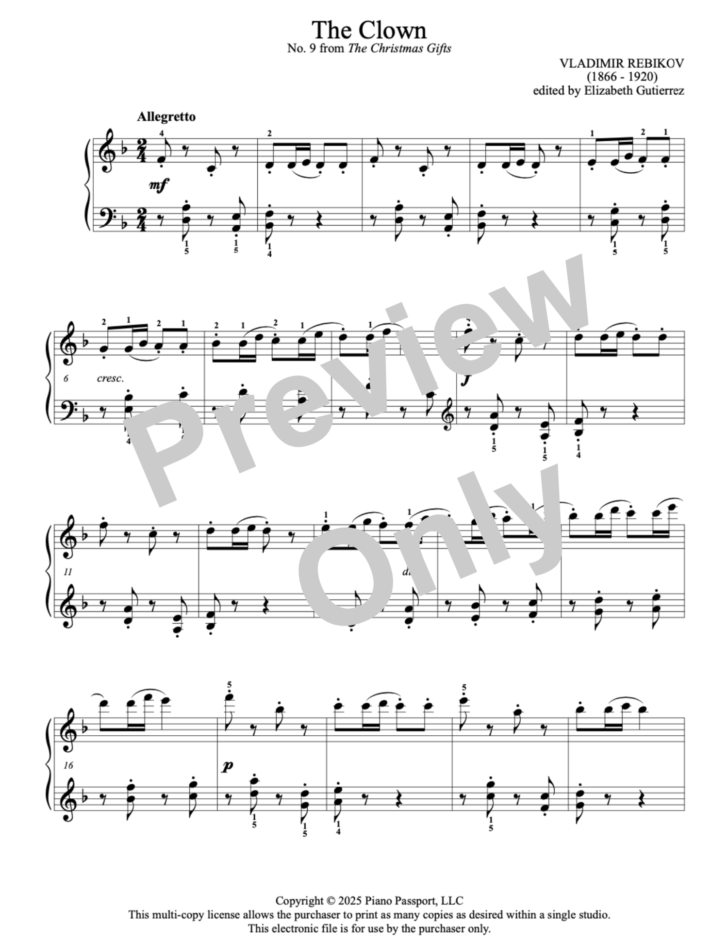 Vladimir Rebikov’s The Clown, from his Les étrennes de Noël (“Christmas Gifts”), is a lively and imaginative character piece. Capturing the playful and mischievous spirit of a clown with crisp staccatos, dynamic contrasts, and vivid rhythms, it’s ideal for early intermediate pianists looking to explore expressive storytelling through music. This student edition offers a carefully edited score, ideal for students and teachers alike. This edition offers practical fingerings and interpretive details to aid pianists in capturing the lyrical style. A charming addition to any repertoire or recital program!